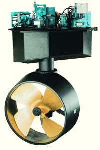 Tunnel thrusters, actual and diagrammatic Azimuth thrusters are propellers mounted on a vertical shaft that project below the vessel, the shaft (therefore the thruster) can rotate through 360 degrees, imagine an outboard motor secured from above, rather than bolted horizontally. An azimuth thruster can rotate and counteract forces from any direction, these are very popular, though they are complicated and require a lot of maintenance.