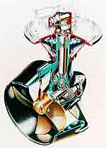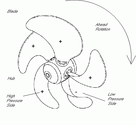 A modern 5 bladed controllable pitch propeller So we have a propeller providing thrust, but we need to accurately control the amount of thrust. From the wood screw analogy we know that if we turn the screw faster it moves through the wood faster. The problem with adjusting the speed is that it is awkward (which means expensive) to do quickly and accurately enough, to give the level of control required for a DP vessel. Another way is to change the pitch (think back to the effect of how far apart the threads are on a screw), a large pitch means large thrust and a small pitch mean small thrust, this is an easily achieved way of controlling the thrust output of a propeller. All that is needed are lots of different propellers, or a way of controlling the blade pitch on one propeller (which is what we do). The most common method of operation for DP vessels is to have an engine room providing large amounts of electrical power, with each thruster being driven by a constant speed A/C motor. This makes thruster installation a lot easier than having to have a diesel engine to drive each thruster, as it means all the power generating machinery can be in one area and electric cabling run to the various thruster compartments. The control of thrust output is implemented by using a controllable pitch propeller which turns at constant rpm but each blade rotates on command, from around -20 degrees pitch for full astern thrust. through zero pitch for zero thrust to +20 degrees pitch for full ahead thrust, each blade is interconnected so they all move the same amount at the same time. Advances in technology (which means expensive stuff gets cheaper) has allowed the use of variable speed A/C motors in some modern thrust units, adjustment of speed is effected by frequency adjustment in the supplied power. This means that the speed and therefore thrust of the propeller can be infinitely controlled up to a motor maximum, allowing very precise control of a fixed propeller. Fixed propellers are desirable as they are cheap(er), low maintenance and easier to calibrate to DP systems.