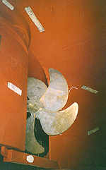 A single blade from a controllable pitch propeller Now that we can control the amount of thrust, we need to be able to point it in the direction we want. Conventional ships use rudders, situated behind their propeller to cause drag on the side that they want to turn towards, obviously the effectiveness of the rudder depends on the water flow past it. This works very well for conventional shipping (though not always, remember the navy ship that collided with London Bridge) but a DP vessel is designed for precise low speed maneouvering or remaining stationary where the rudder is totally inefficient. We need to be able to direct our thrust more effectively. There are 3 main types of propeller driven thruster, the normal propeller as found on every cargo ship, the tunnel thruster and the azimuthing thruster. The main propellers (normally 2 are fitted on offshore oilfield support type vessels) are situated as normal towards the stern, they are designed to counteract the fore and aft forces on the vessel.
