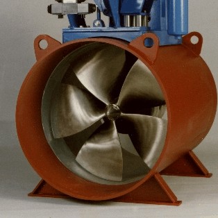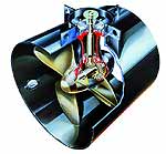 Azimuth thrusters, actual and diagrammatic You will notice that the azimuth thruster has a nozzle around the propeller, not all do but it is common. The nozzle is commonly called a Kort Nozzle (after the company that introduced it). Research has proven (for the mathematically minded the research was based on Bernouilli's continuity equation) that at slow speeds, the nozzle improves the efficiency of water flow (and hence of the propeller). At higher speeds, the additional drag of the nozzle structure negates the efficiency increase.